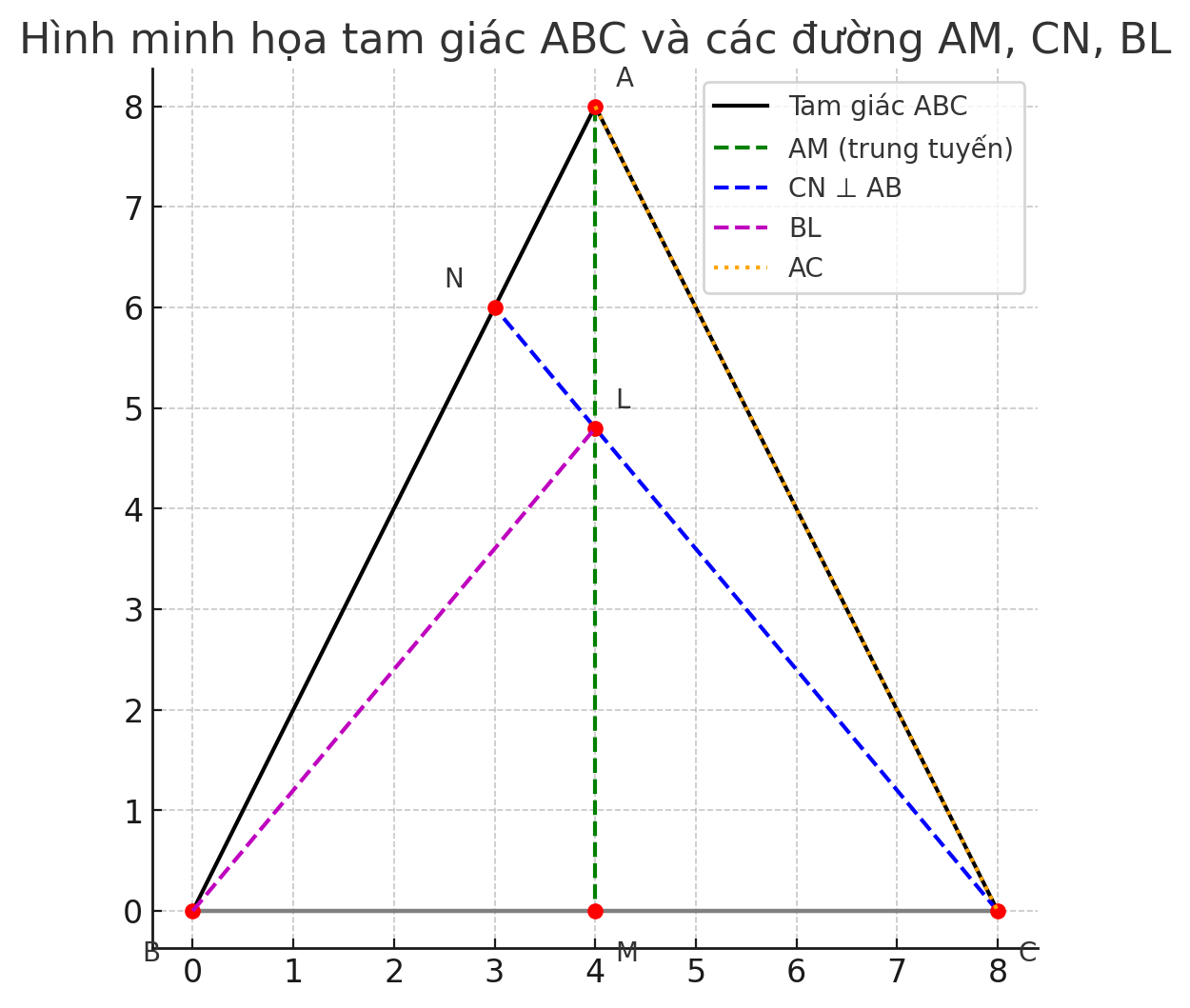 Khi đó, điểm L là trực tâm tam giác ABC (do CN và AM là 2 đường cao)