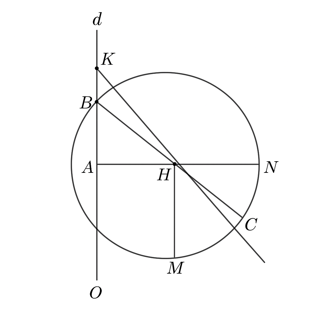 Cho đường tròn tâm O và A thuộc (O) trên tiếp tuyến tại A của (O) lấy K Qua K vẽ đường thẳng d cắt (O) tại 2 điểm B và C ( d không đi qua O, B nằm giữa K và C) . Gọi M là trung điểm của BC . Vẽ đường kính AN . Đường thẳng đi qua A và vuông góc với BC cắt MN tại H Chứng minh CH vuông góc với AB