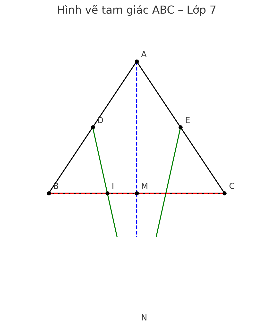 Chúng ta có một tam giác ABC với đường trung tuyến AM. Điểm N được lấy đối xứng với A qua M. D và E là trung điểm của AB và AC, tức là DE là đường trung bình của tam giác ABC. I là giao điểm của ND và NE với BC.