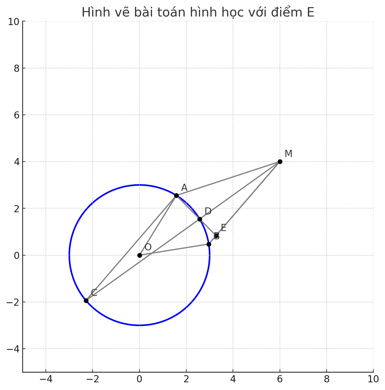 b) Ta có các điểm A,D thuộc đường tròn và E là giao điểm của hai dây AD và MB.