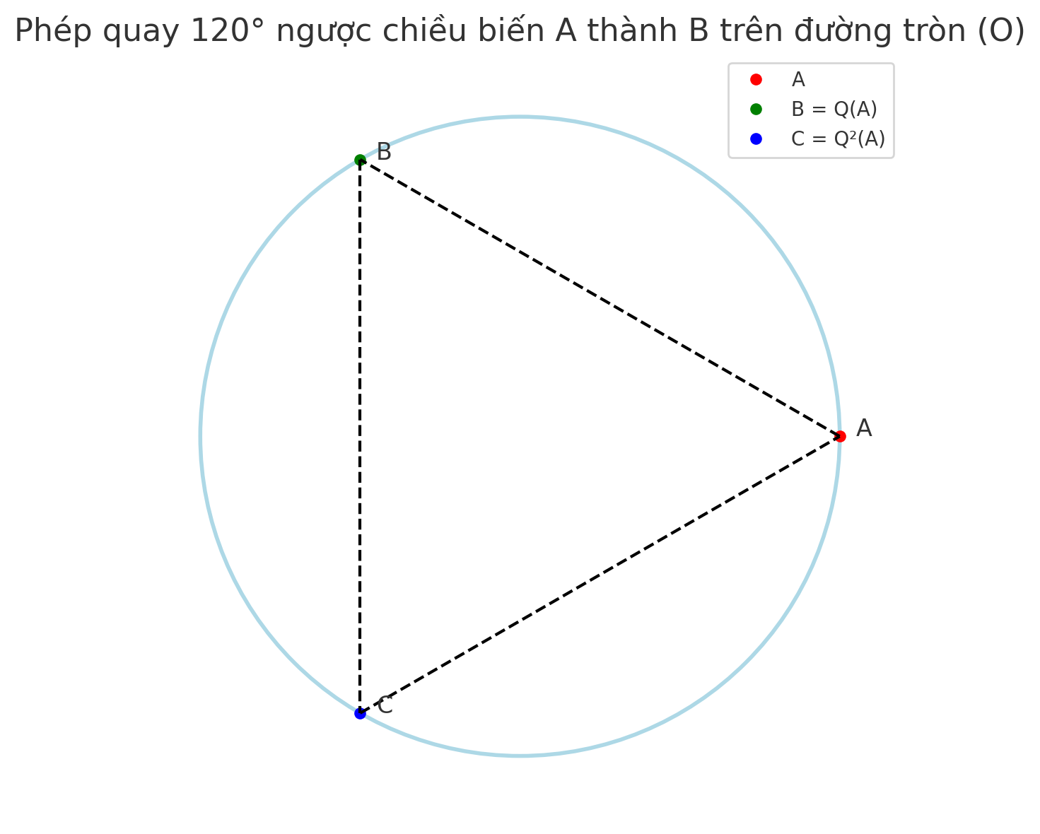 Xét đường tròn (O) với tâm O, giả sử điểm A nằm trên đường tròn. Ta thực hiện phép quay ngược chiều kim đồng hồ 120° quanh tâm O.