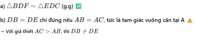 - a) \(\triangle BDF\) đồng dạng với \(\triangle EDC\)