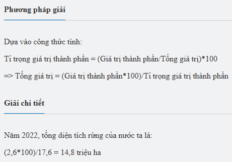 Đáp số: Năm 2022, tổng diện tích rừng của nước ta là khoảng 14,8 triệu ha.