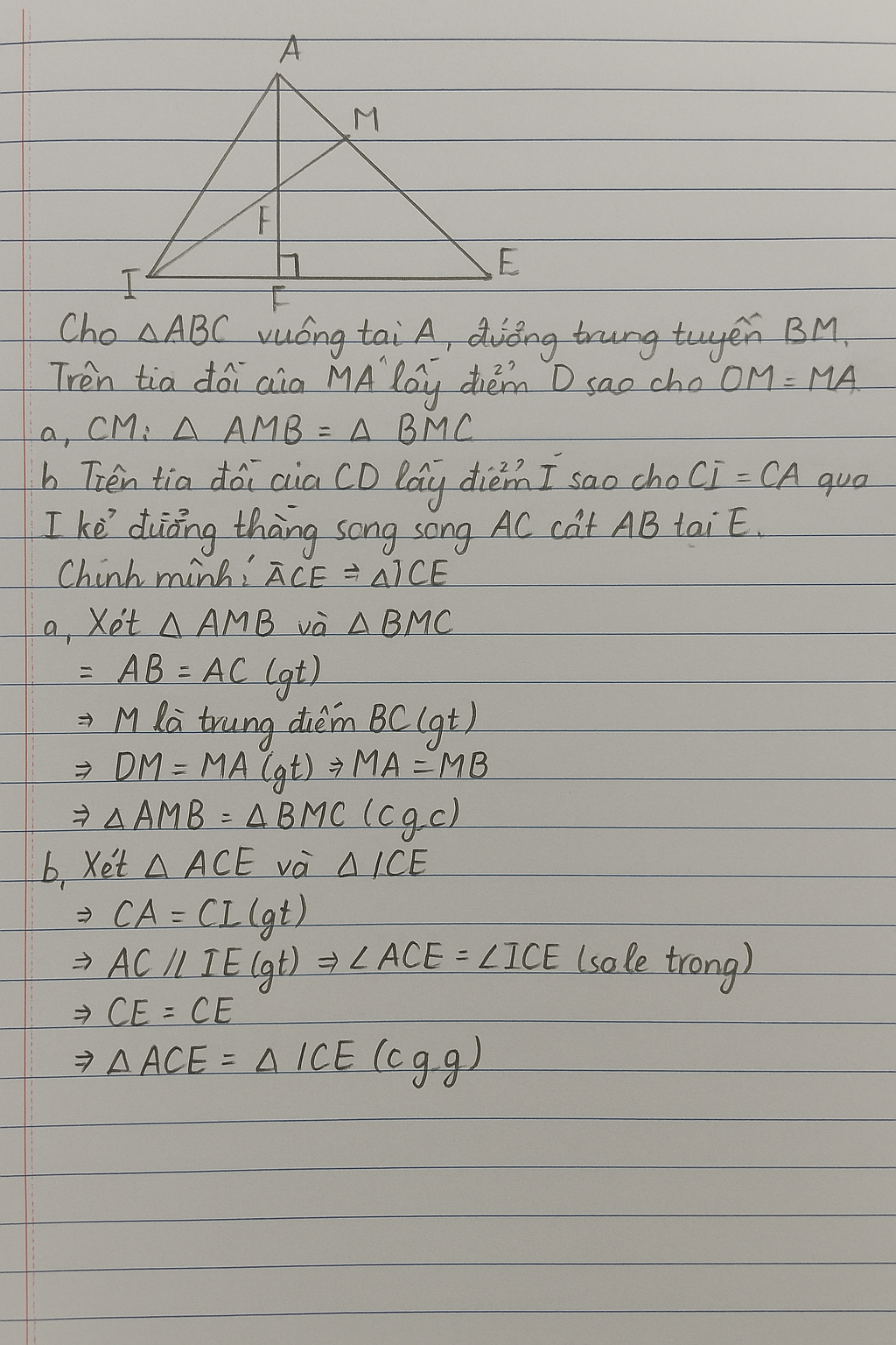b, Trên tia đối tia CD lấy điểm I sao cho CI=CA qua điểm I kẻ đường thẳng song song AC cắt AB tại E .Chứng minh:🔼ACE=🔼ICE