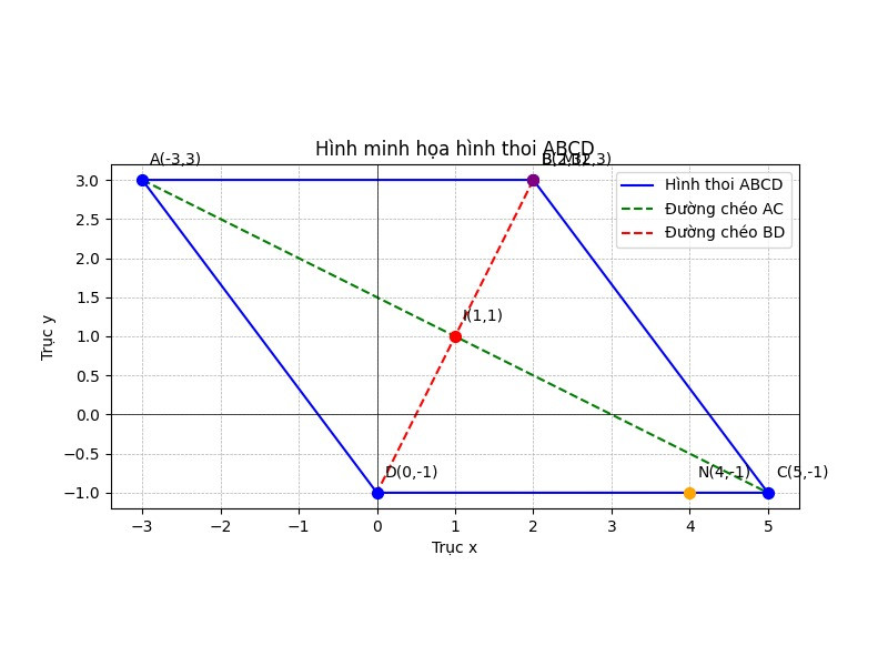 Lấy đối xứng $N$ qua $I$ được $N' = (2 \cdot 1 - 4, 2 \cdot 1 - (-1)) = (-2, 3)$.