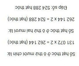 Rô bốt đặt các hạt thóc vào bàn cờ theo quy tắc ô thứ nhất dặt 1 hạt thóc, ô thứ 2 đặt 2 hạt thóc, ô thứ ba đặt 3 hạt thóc và cứ như vậy số hạt thóc đặt vào ô trước đó . Biết ô thứ 18 đặt 131072 hạt thóc. Hỏi rô bốt đặt được bao nhiêu hạt thóc vào ô thứ 20 ?