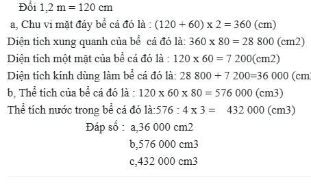 Một bể nuôi cá hình hộp chữ nhật có chiều dài 1,2 m chiều rộng 60m và chiều cao 80m