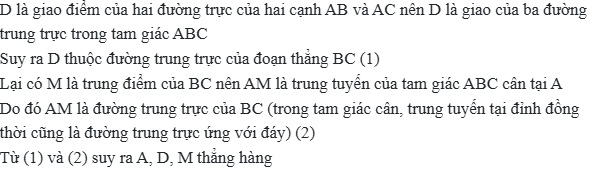 D là giao điểm của hai đường trực của hai cạnh AB và AC nên D là giao của ba đường trung trực trong tam giác ABC