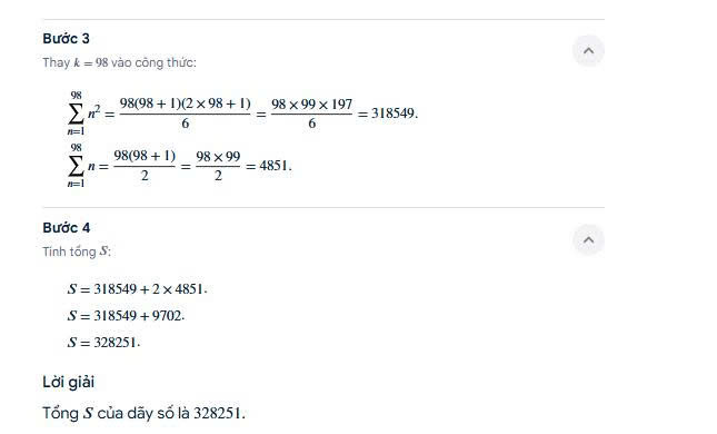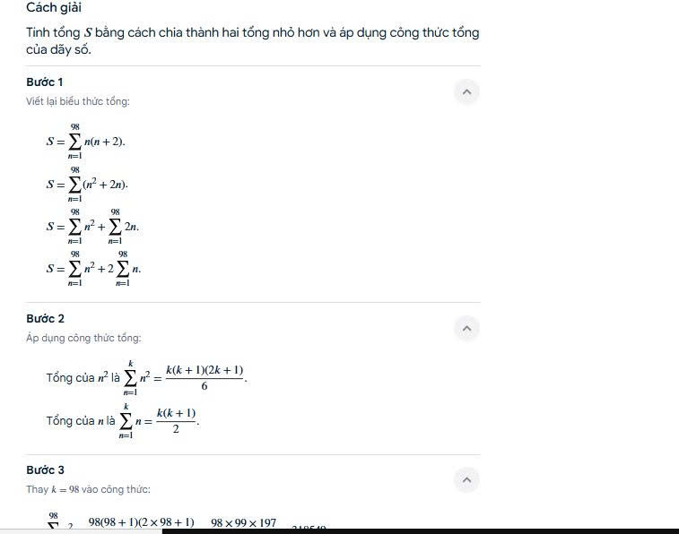 Bây giờ, chúng ta sẽ nhóm các số hạng lại: S=(1×2+2×3+3×4+⋯+98×99)+(1+2+3+⋯+98)
