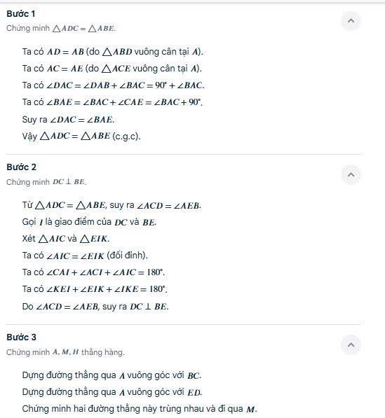 Suy ra: ∠DAC = ∠DAB + ∠BAC + ∠CAE = 45° + ∠BAC + 45° = ∠BAC + 90° ∠EAB = 45°, ∠BAD = 45° → tổng góc tại A là 90°
