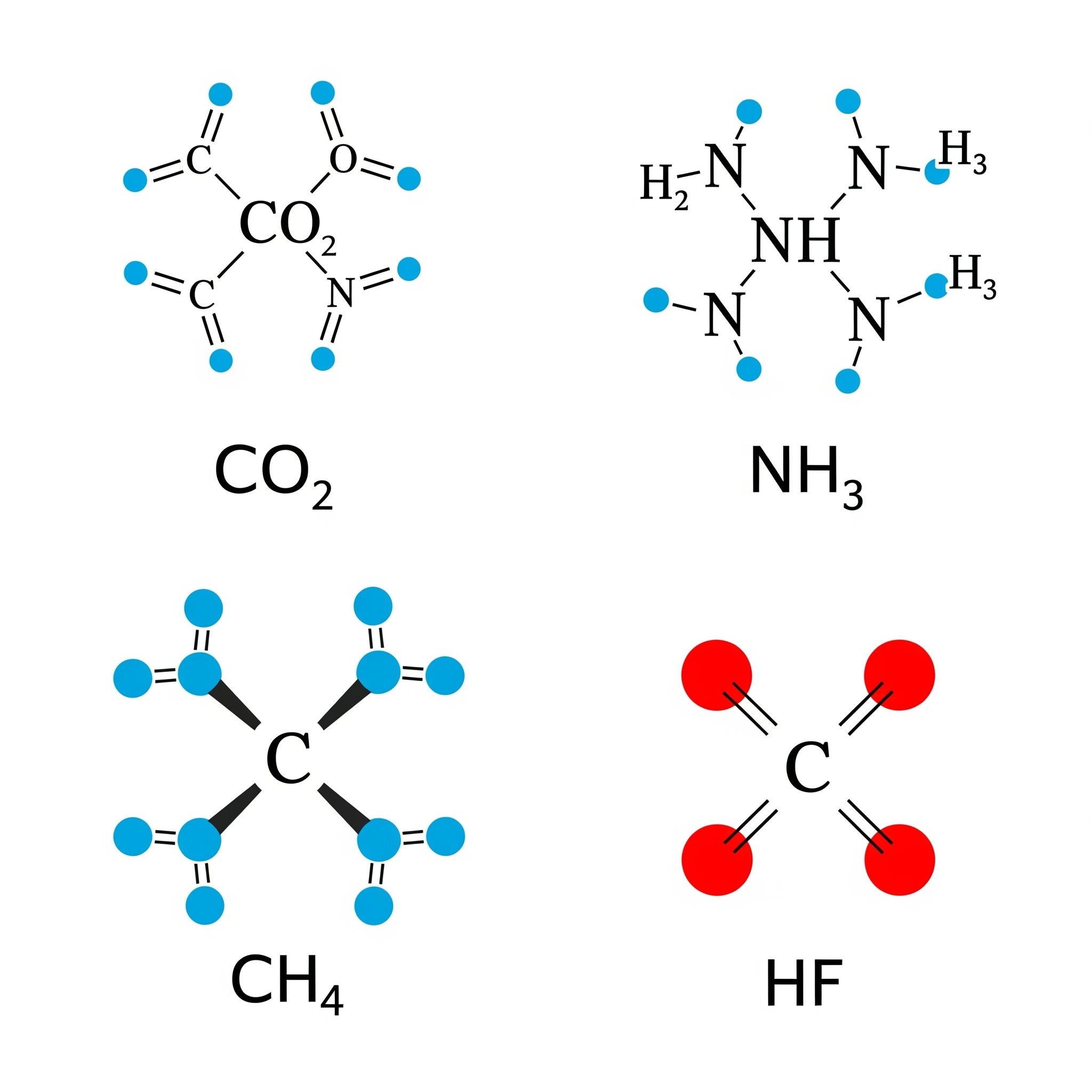 Trong Hóa học, sơ đồ liên kết hóa học biểu diễn cách các nguyên tử liên kết với nhau để tạo thành phân tử. Dưới đây là sơ đồ liên kết hóa học của các phân tử CO₂, NH₃, CH₄ và HF (sử dụng thay thế cho H₂F vì H₂F là một chất không bền).