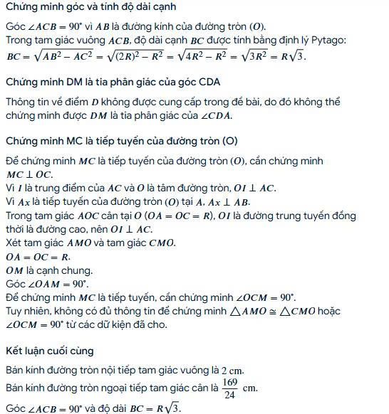 Hoặc đưa ra sơ đồ/điểm gốc (ví dụ: đặt O ở gốc tọa độ, đường tròn (o) có bán kính R và AB là đường kính nằm trên trục x), mình sẽ giúp bạn làm rõ từng câu a, b, c và chứng minh tương ứng một cách chi tiết, kèm công thức và lời giải đầy đủ.