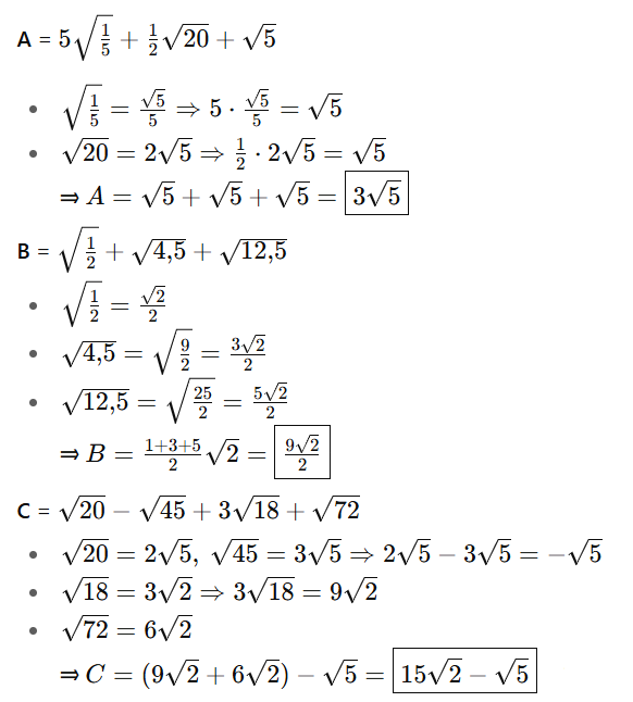 ### **3. Tính C = √20 - √45 + 3√18 + √72**