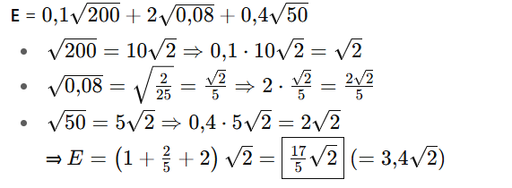 ### **4. Tính E = 0.1√200 + 2√0.08 + 0.4√50**