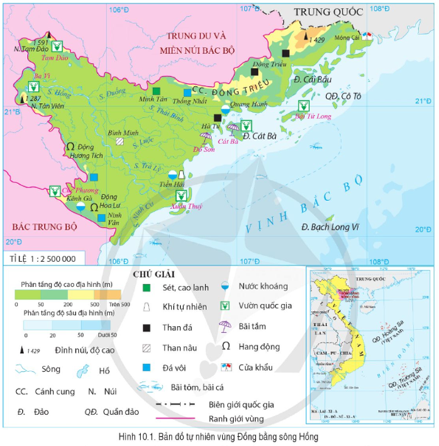 - Đặc điểm phạm vi lãnh thổ: diện tích tự nhiên 21,3 nghìn km2, chiếm 6,4% diện tích cả nước. Bao gồm: Thủ đô Hà Nội, TP Hải Phòng và các tỉnh: Hải Dương, Hưng Yên, Thái Bình, Quảng Ninh, Bắc Ninh, Vĩnh Phúc, Nam Định, Hà Nam, Ninh Bình. Có vùng biển rộng với hàng nghìn đảo, quần đảo, có 4 huyện đảo là: Cát Hải, Bạch Long Vĩ, Cô Tô, Vân Đồn,…