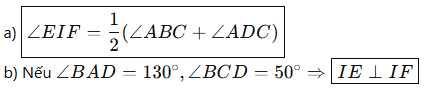 b) Nếu Góc BAD =130° và Góc BCD = 50° thì IE vuông góc IF