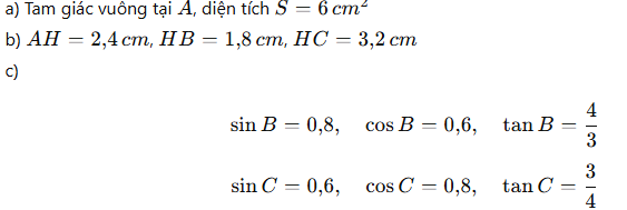 c) Tính tỉ số lượng giác của góc B, từ đó suy ra tỉ số lượng giác của góc C