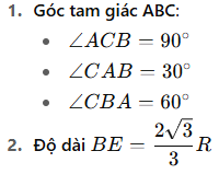 cho đường tròn tâm ( o ), đường kính AB=2R và d là tiếp tuyến của B của (o) . trên (o) lấy điểm C sao cho BC =R ,tia AC cắt d tại E . tính số đo các góc của tam giác ABC / tính độ dài BE theo R
