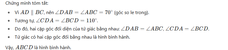 Cho tứ giác ABCD có AD song song với BC; góc ABC=70 độ góc BCD=110 độ. Chứng minh tứ giác ABCD là hình bình hành