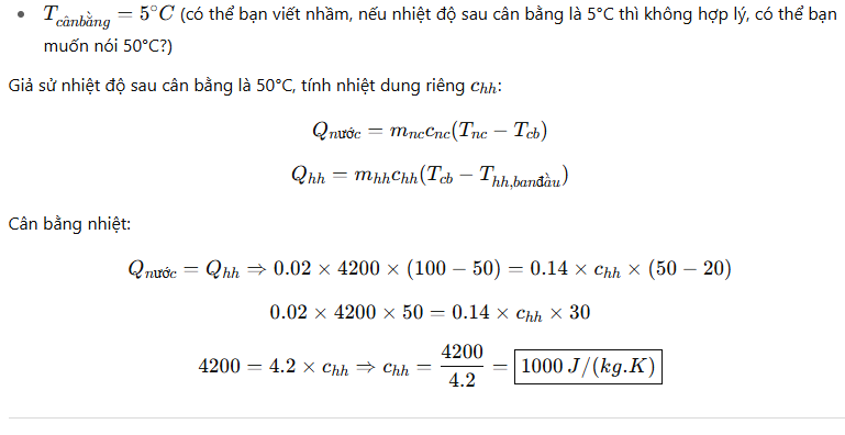Câu 3. Để xác định nhiệt dung riêng của một chất lỏng, người ta đổ chất lỏng đó vào 20g nước ở 100 deg * C Khi có sự cân bằng nhiệt, nhiệt độ của hỗn hợp nước là 5 deg * C m hh =140g . Biết nhiệt độ ban đầu của nó là 20 deg * C nhiệt dung riêng của nước là của chất lỏng trên là bao nhiêu ( 10 ^ 3 J kg.K ) Nhiệt dung riêng 4200 J kg .K .