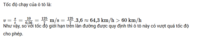 Camera của thiết bị "bắn tốc độ" ghi và tính được thời gian một ô tô chạy qua giữa hai vạch mốc cách nhau 10 m là 0,56 s .Nếu tốc độ giới hạn trên là đường được quy định là 60km/h thì ô tô này có vượt quá tốc độ cho phép không?