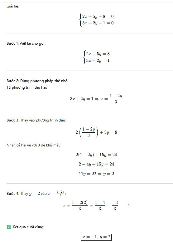 Giải hệ phương trình : 2x + 5y - 8 = 0 và 3x + 2y - 1 = 0