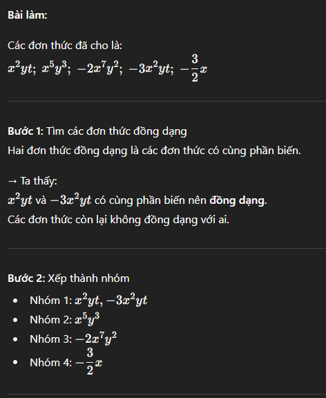 - Các đơn thức còn lại không đồng dạng với nhóm này.