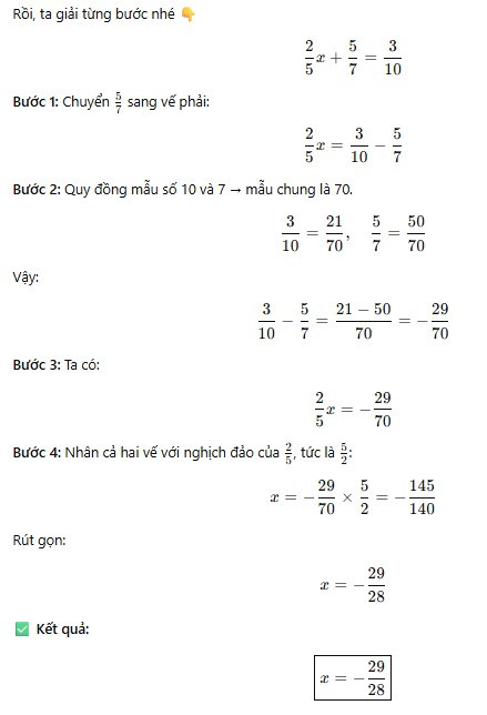Tìm x biết 2/5x + 5/7 = 3/10