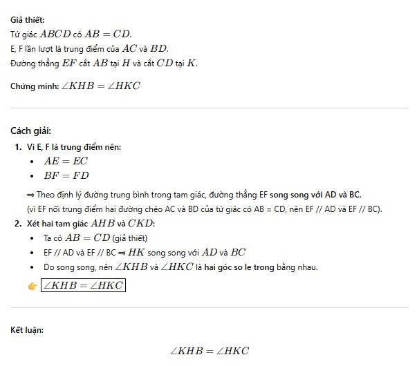 Nếu bạn muốn, mình có thể vẽ hình minh họa (với ký hiệu trung điểm, đường EF, và các góc KHB, HKC) để bạn thấy rõ hơn tại sao hai góc đối xứng nhau.