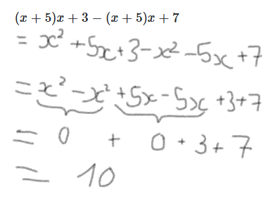 Bước 2: Hai hạng tử ((x+5)x - (x+5)x = 0)