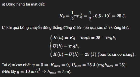 Một học sinh ném một quả bóng có khối lượng 500g theo phương thẳng đứng lên cao từ mặt đất với vận tốc ban đầu là 10m/s. Chọn góc thế năng tại mặt đất.