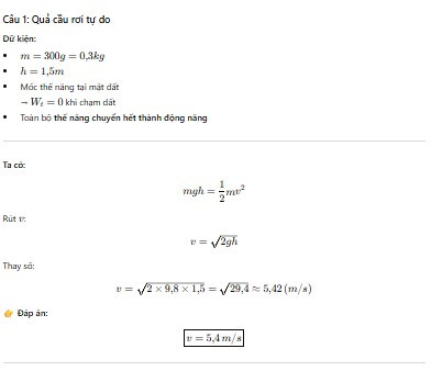 Câu 1 .Thả một quả cầu nặng 300 g từ độ cao 1,5 m so với mặt đất ,chọn mốc thế năng tại mặt đất. Hỏi khi vật vừa chạm đất tốc độ của vật bằng bao nhiêu, biết thế năng chuyển hía hoàn toàn thành động năng