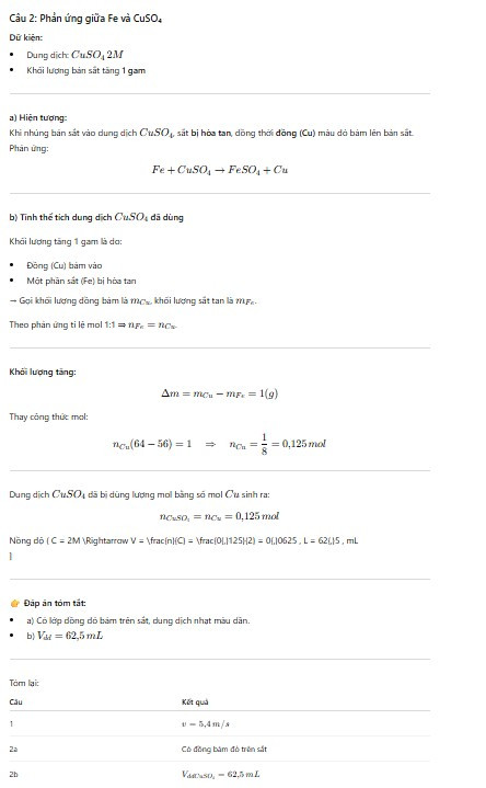 Câu 2. nhúng một bản sắt vào dung dịch CuSO4 2M sau phản ứng nhấc bản sắt và rửa nhẹ làm khô thấy khối lượng tăng 1 gam