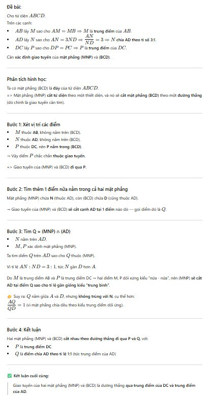Cho tứ điện ABCD. Trên cạnh AB, AD, DC lần lượt lấy điểm M, N, P sao cho AM=MB, AN=3ND, DP=PC. Xác định giao tuyến của MNP và BCD