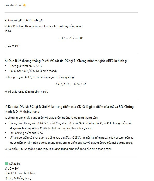 c) Kéo dài DA cắt BC tại P. Gọi M là trung điểm của CD, O là giao điểm của AC và BD. Chứng minh 3 điểm P,O,M thẳng hàng