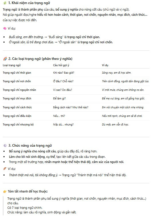 Trạng ngữ là thành phần phụ của câu, dùng để bổ sung ý nghĩa về thời gian, nơi chốn, nguyên nhân, mục đích, cách thức, phương tiện, điều kiện... cho hành động, sự việc được nêu trong câu.