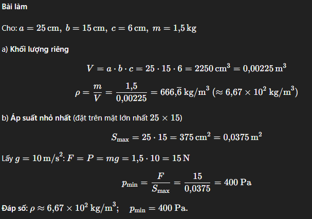 Một viên gạch dạng hình hộp chữ nhật có kích thước các chiều dài, rộng, cao lần lượt là 25cm; 15 cm; 6cm. Biết viên gạch nặng 1,5kg.