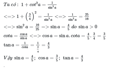 cho cot a=3/4.Tính sin a, cos a, tan a