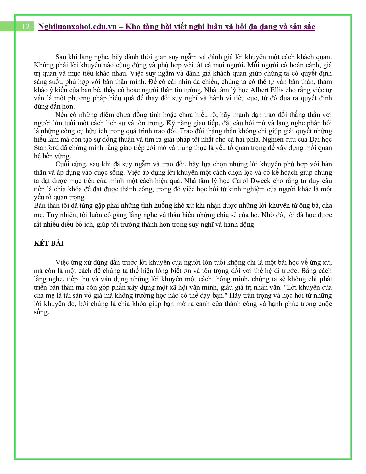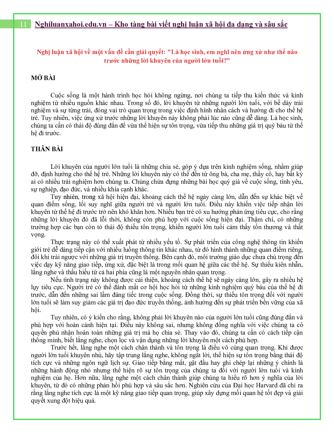 Tóm lại, khi nhận được lời khuyên từ người lớn, học sinh cần lắng nghe, suy nghĩ, chọn lọc và biết trân trọng. Đó không chỉ là cách ứng xử đúng mực mà còn là biểu hiện của một người có văn hóa, có đạo đức và biết học hỏi để trưởng thành.