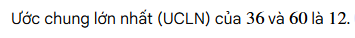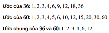Phân tích ra thừa số nguyên tố: 36 = 2² × 3² 60 = 2² × 3 × 5 Lấy các thừa số chung với số mũ nhỏ nhất: → 2² × 3 = 12 👉 ƯC(36; 60) = 12 ✅