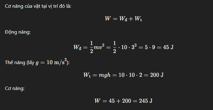 👉 Vậy cơ năng của vật tại vị trí đó là 241 joule. Nếu bạn muốn mình giải thêm bài tương tự hoặc nâng cao hơn, cứ nói nhé!