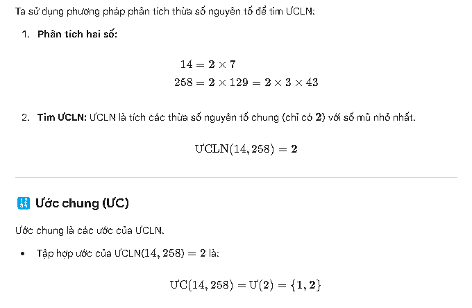 => Trong các ước chung: 1, 2 → ƯCLN(14, 258) = 2