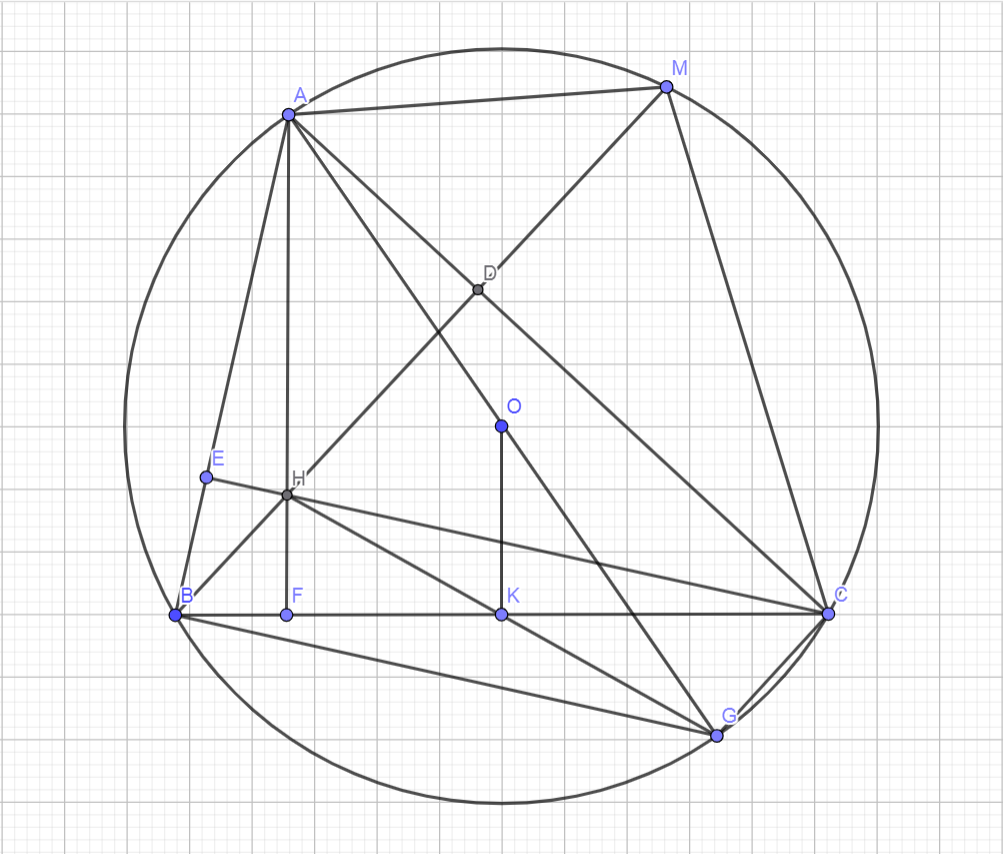 b) Kẻ OA cắt (O) ={G} => OA là đg kính =>BHCG là HBH => K là trung điểm HG mà O là trung điểm AG => đg trung bình => ok