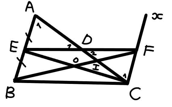cho tam giác ABC,vẽ tia Cx song song với AB.từ trung điểm E của AB vẽ đường thẳng song song với BC cắt AC tại D và cắt tia Cx tại F .đường thẳng BF cắt AC tại I