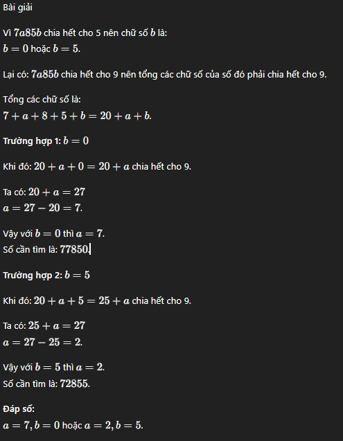 Trường hợp 2: (b = 5) Nếu (b = 5), tổng các chữ số là (20 + a + 5 = 25 + a). Để (7a855) chia hết cho 9, tổng (25 + a) phải chia hết cho 9. Vì (a) là một chữ số, nên (0 \le a \le 9). Do đó, (25 \le 25 + a \le 34). Các bội số của 9 trong khoảng từ 25 đến 34 là 27. Ta có phương trình: (25 + a = 27). Suy ra: (a = 27 - 25 = 2). (Nếu xét bội số tiếp theo của 9 là 36, ta có (25 + a = 36 \implies a = 11), điều này không thể vì (a) phải là một chữ số). Vậy, trong trường hợp này, ta có (a = 2) và (b = 5). Số đó là $72855$.