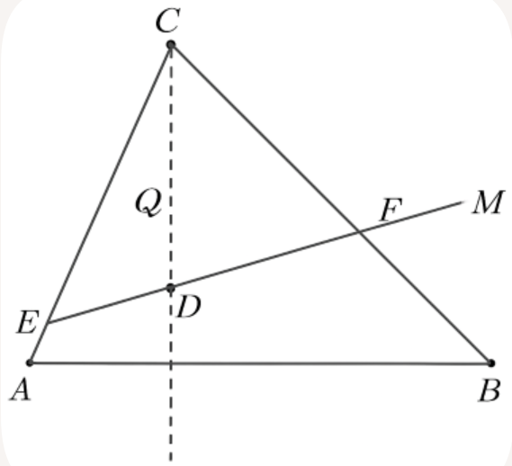 Xét $\triangle B M C$ và đường thẳng $E F$ (cắt $B C$ tại $D$ và $B M$ tại $M$, $C F$ là đường $A C$).
