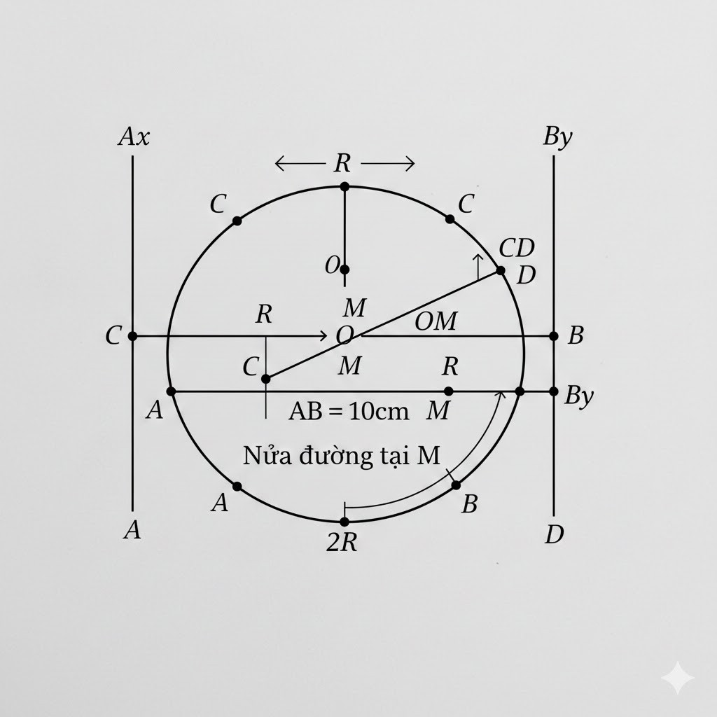 Cho nửa đường tròn tâm O đường kính AB bằng 2R. kẻ các tiếp tuyến Ax By với tâm O( ax by nằm cùng phía đối với nửa đường tròn tâm O )Gọi M là một điểm trên đường tròn (m khác A và B )tiếp tuyến tại M của nửa đường tròn, cắt Ax By thứ tự ở C và D . Vẽ hộ mình