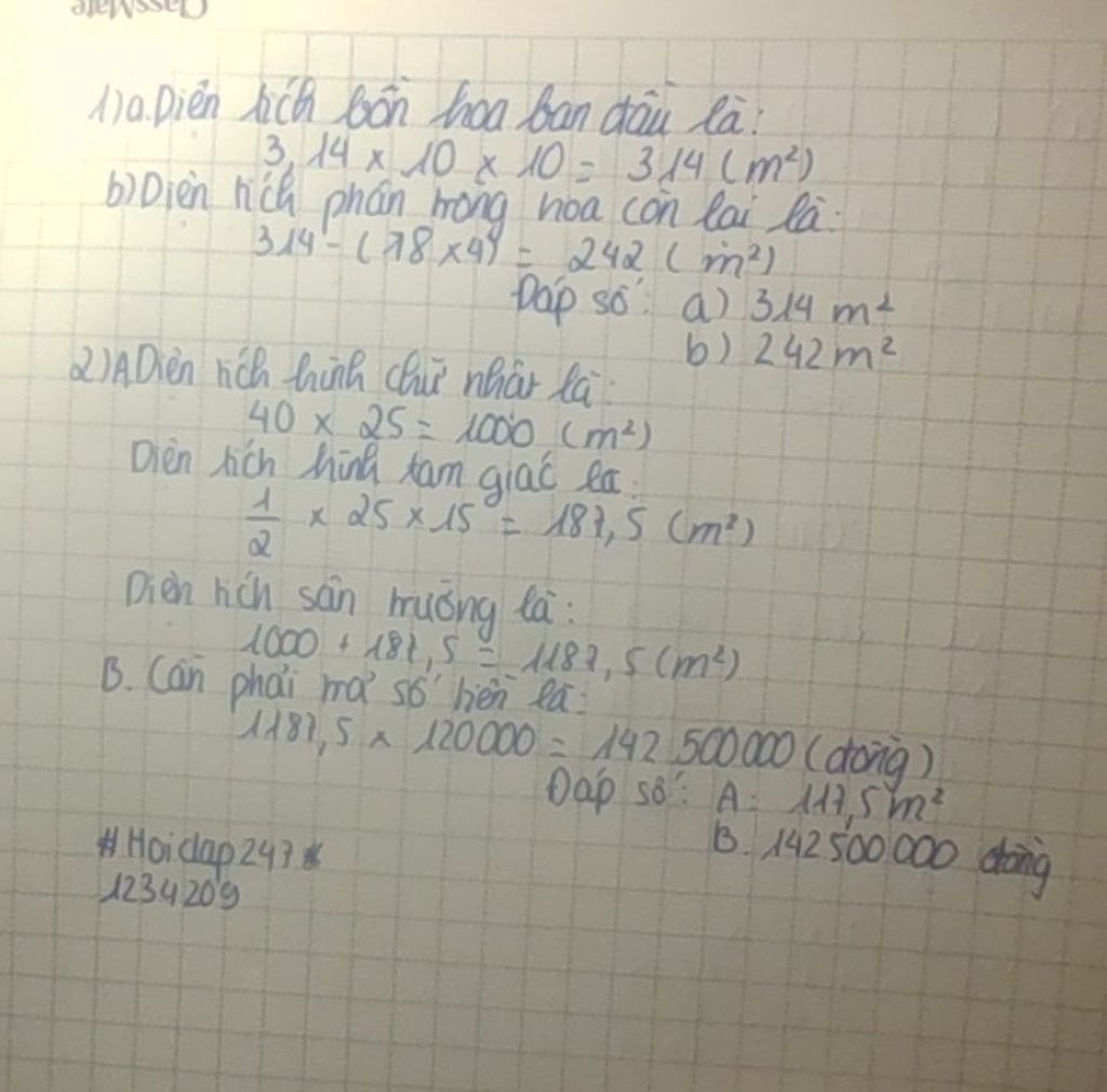 Diện tích phần hoa: 314 − 72 = 242 m²