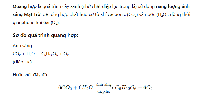 Quang hợp là quá trình thực vật (và các sinh vật tự dưỡng khác) sử dụng ánh sáng mặt trời để chuyển đổi nước và khí Carbon dioxide ($CO_2$) thành chất hữu cơ (đường Glucose) và giải phóng khí Oxygen ($O_2$).