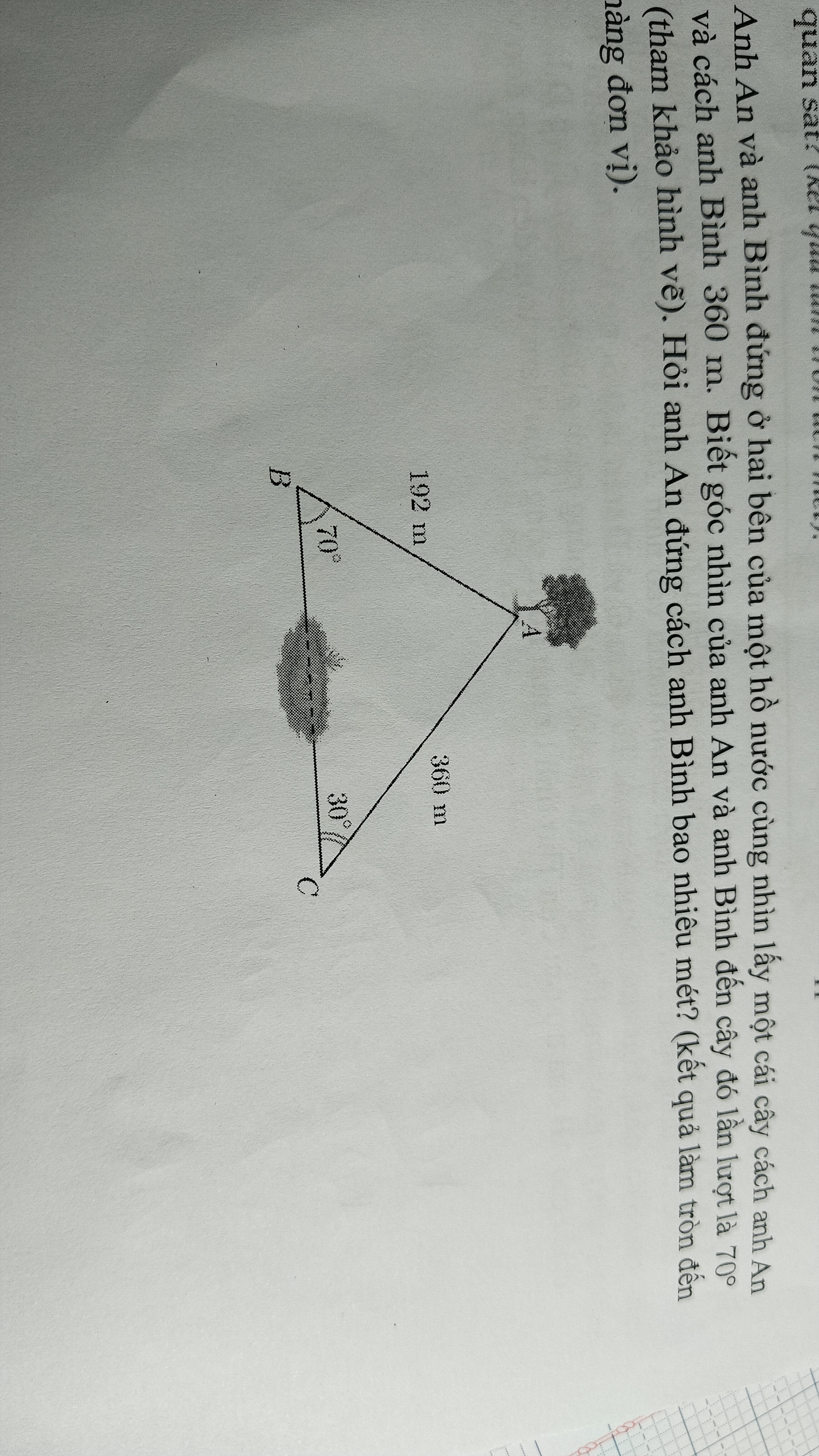 Anh An và anh Bình đứng ở hai bên của một hồ nước cùng nhìn lấy một cái cây cách anh An 192m và cách anh Bình 360 m.biết góc nhìn của anh An và anh Bình đến cây đó lần lượt là 70° và 30°. hỏi anh An đứng cách anh Bình bao nhiêu mét (kết quả làm tròn đến chữ số hàng đơn vị)